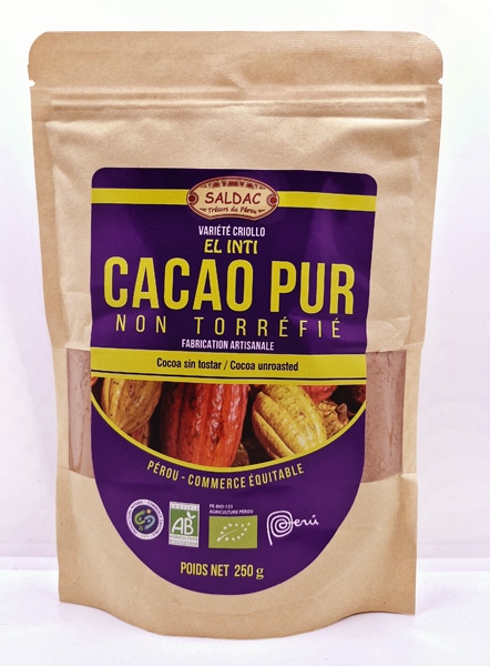 Cacao NON torréfié en poudre, biologique. Transformé au Pérou par une petite chocolaterie à moins de 42°C avec les fèves Criollo de la coopérative Pangoa et les fèves Chuncho (une variété locale de Criollo) de la coopérative Alto Urubamba. Puissant en arôme et très fruité. Excellent pour les chocolats chauds ou froids, les gâteaux. Encore plus de vitamines que dans le cacao torréfié.