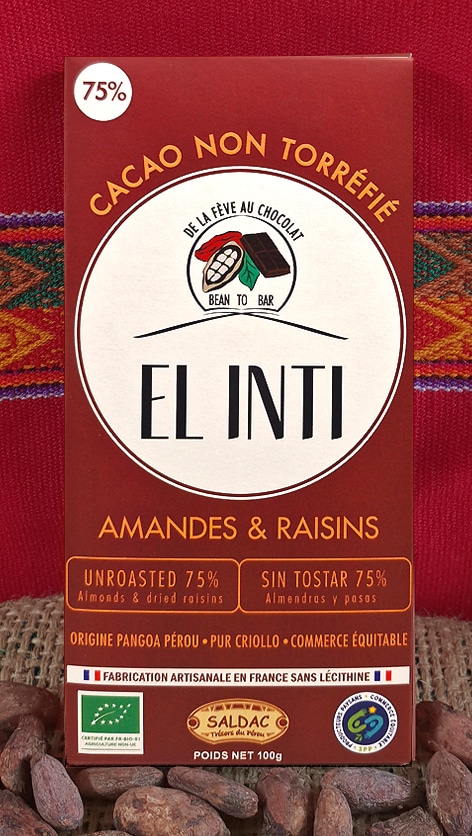 Tablette NON torréfiée noir 75 % de cacao, fèves de la Coop. Pangoa Pérou, sucre de canne complet du Pérou (panela), biologique, amandes 10 % et raisins secs 5 %.