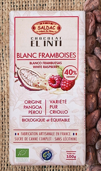 Chocolat blanc 40 % de cacao aux framboises 7%, beurre de cacao réalisé avec les fèves de la Coop. Pangoa Pérou, sucre de canne complet du Pérou (panela), lait entier, framboises lyophilisées, biologique. Un grand cru blanc, un peu beige par la couleur du sucre de canne complet, excellente combinaison avec le fruité et l’acidité des framboises, aromatique à souhait, avec une touche de vanille pour relevé le tout !