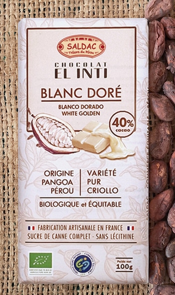 Chocolat blanc 40 % de cacao, beurre de cacao réalisé avec les fèves de la Coop. Pangoa Pérou, sucre de canne complet du Pérou (panela), lait entier, biologique. Un grand cru blanc, un peu beige par la couleur du sucre de canne complet, excellent, très parfumé, avec une touche de vanille pour relevé le tout !