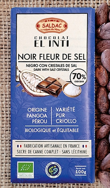 Chocolat noir 70 % de cacao, 1 % de fleur de sel de Guérande, sucre de canne complet du Pérou, biologique. Contraste surprenant entre la fleur de sel et le chocolat noir. Intense et aromatique.