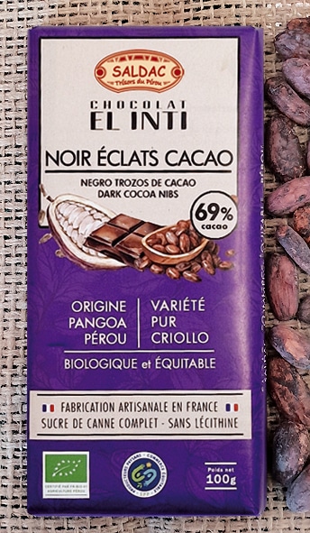 Chocolat noir 63 % de cacao et 15 % d’éclats de fèves grillées, fèves de la Coop. Pangoa Pérou, sucre de canne complet du Pérou, biologique. Pour les connaisseurs de chocolats “Grand Cru”. Pure origine Criollo, très fruité et croustillant.